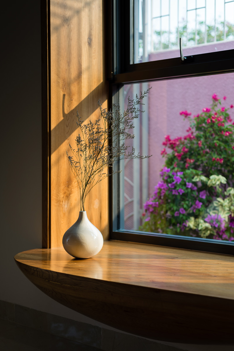 The bay window, the oak wood handicraft table and chairs are designed by the natural curves. The light on wooden surface can really bring out a joy, and warm feelings.