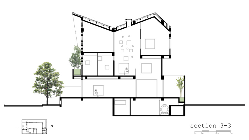 With the requirements to have a house with a slopping roof coverd by traditional tiles, we designed the house to show its dynamics and youth inside. The whole house is proposed as a sculpture. The random layout of colorful glass tiles make the rooms interesting and eye-attracting.